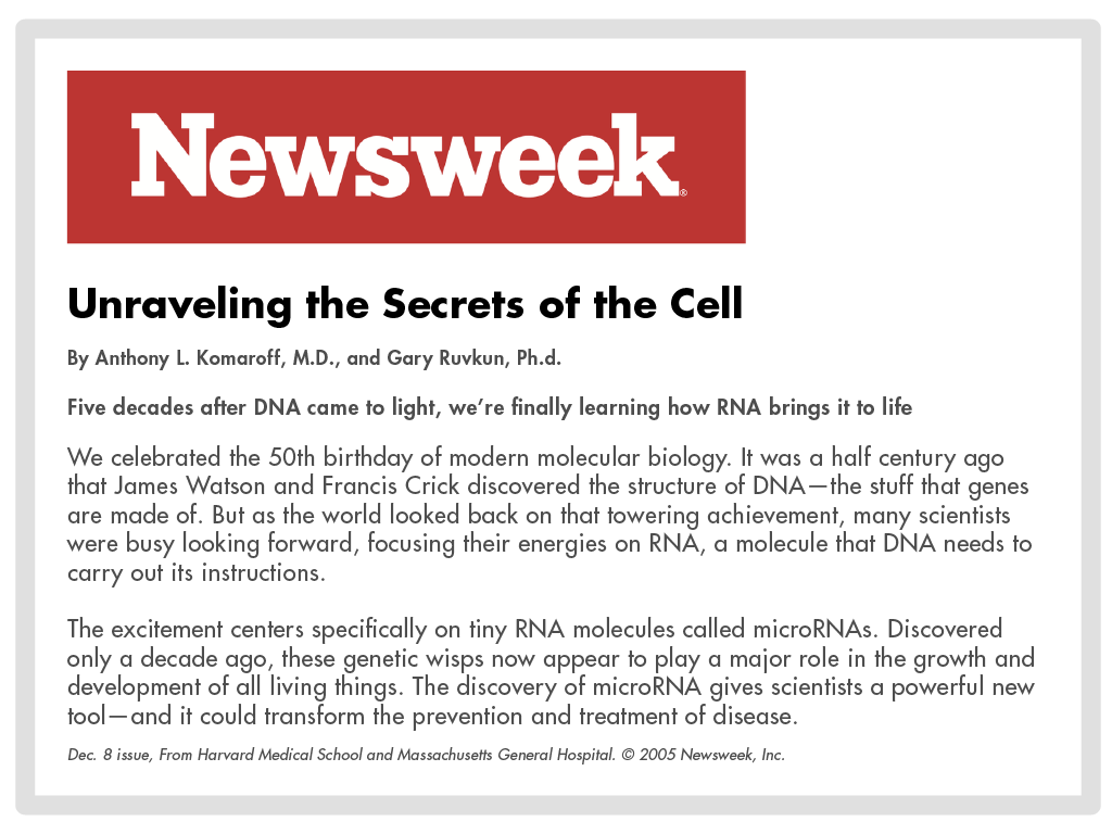 This thought is echoed by Nobel Prize laureate Thomas Cech, “Is there no end to the versatility of RNA?” (Cech, T. Nature, March 18, 2004).