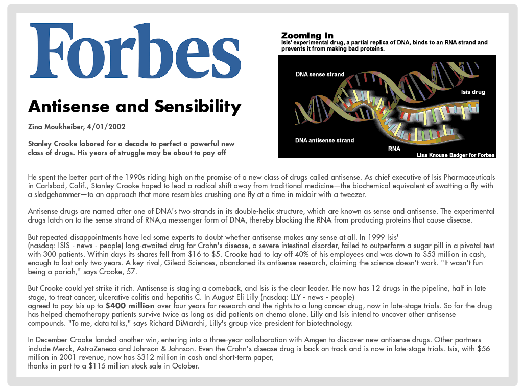 Hundreds of millions of dollars have been spent so far in an attempt to utilize these modified RNAs or DNAs as a means of imitating a natural regulatory process (Chemical & Engineering News, April 28, 2003, Chemical & Engineering News, October 7, 2002, Chemical & Engineering News, May 6, 2002). Systemic delivery issues continue to plague this field. After almost ten years and nearly half a billion dollar pharmaceutical investment deal, a potential cancer drug that operates via an antisense mechanism remains stuck in clinical trials (Nature Biotechnology, September, 2004).